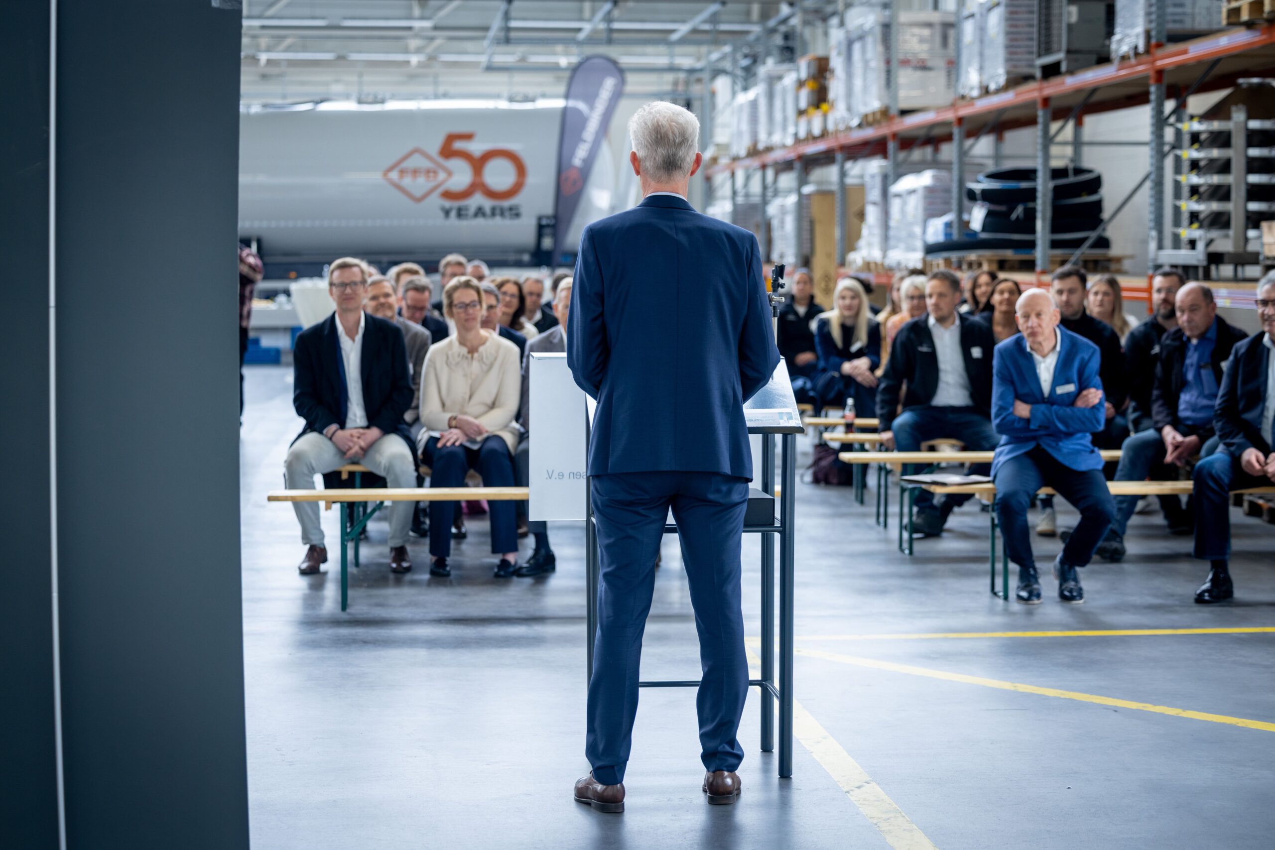 Zur feierlichen Preisverleihung hatten sich die Gäste aus Politik und regionaler Wirtschaft im hochmodernen Logistikzentrum der Preisträgerin versammelt. Auch viele Konstrukteure der Firma waren der Einladung gefolgt, denn ihnen und den Kollegen in den Produktionshallen galt der besondere Dank der Feldbinder Geschäftsführung. Die Laudatio hielt Volker Meyer, Geschäftsführer der Heinrich Meyer-Werke Breloh GmbH – ein langjähriger Bekannter und Kunde des Unternehmens: ,,Die Feldbinder Spezialfahrzeugwerke GmbH könnte keine Technologieführerschaft innehaben, wenn sie nicht selbst ausbilden würde, um zukunftsfähige Lösungen für ihre Kunden zu finden,“ ehrte er die Preisträgerin.