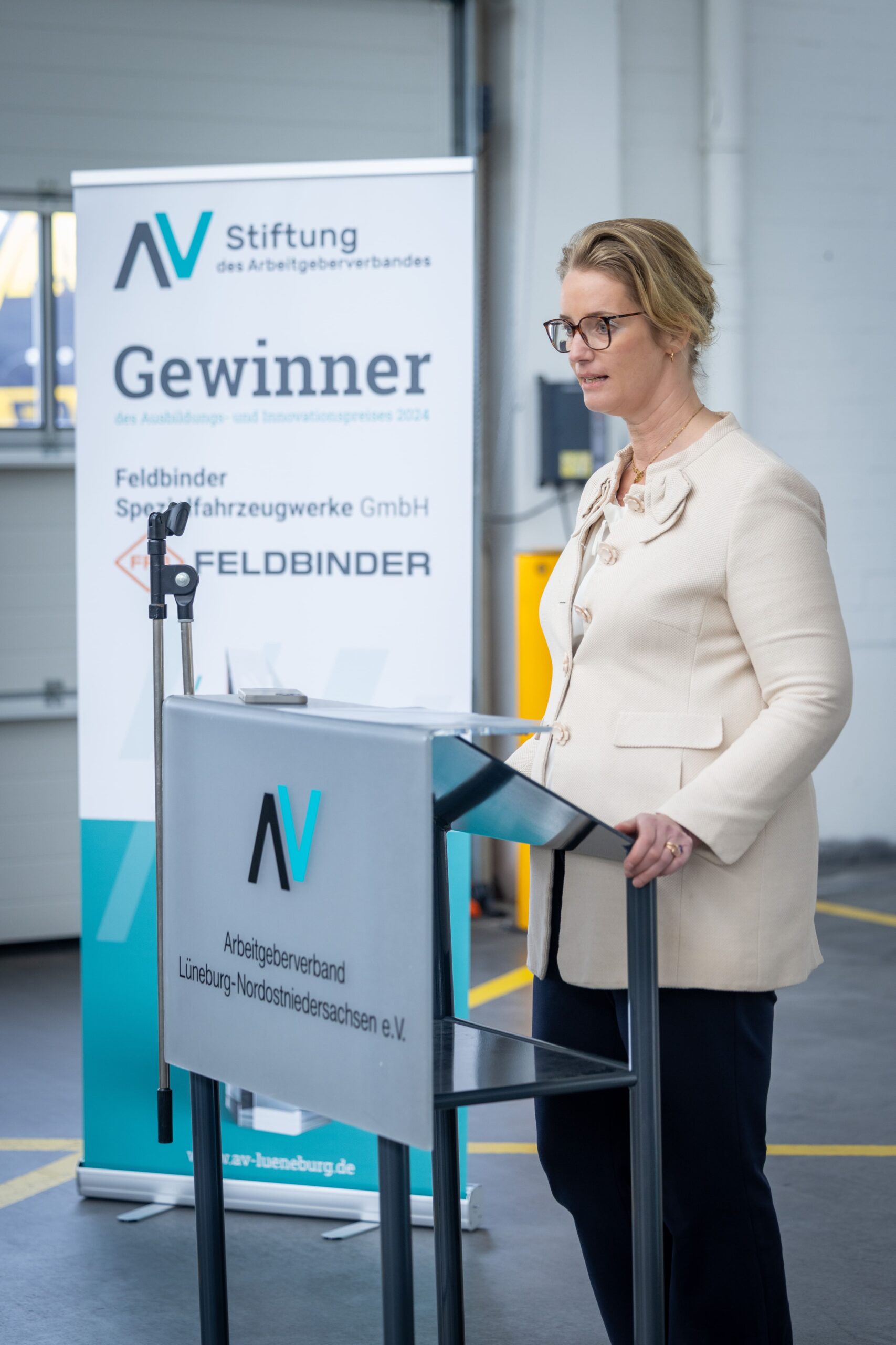 Jährlich zeichnet unsere Stiftung des Arbeitgeberverbandes Lüneburg-Nordostniedersachsen (AV) Unternehmen, Bildungseinrichungen oder Privatpersonen aus, die sich in besonderer Weise auf dem Gebiet der Ausbildung oder Innovation hervorgetan haben. Jetzt wurde die Feldbinder Spezialfahrzeugwerke GmbH aus Winsen mit dem Ausbildungs- und Innovationspreises 2024 ausgezeichnet. Der Preis ist mit 5000 Euro dotiert. Die Jury der AV-Stiftung hat insbesondere das Engagement in der Ausbildung aber auch die Weiterentwicklung des Spezialfahrzeugbaus überzeugt. „Die Feldbinder Spezialfahrzeugwerke GmbH ist ein Vorbild für die Region“, so Markus Meyer (Sieb + Meyer AG), Vorsitzender des Stiftungsrats, in seiner Begrüßungsrede.