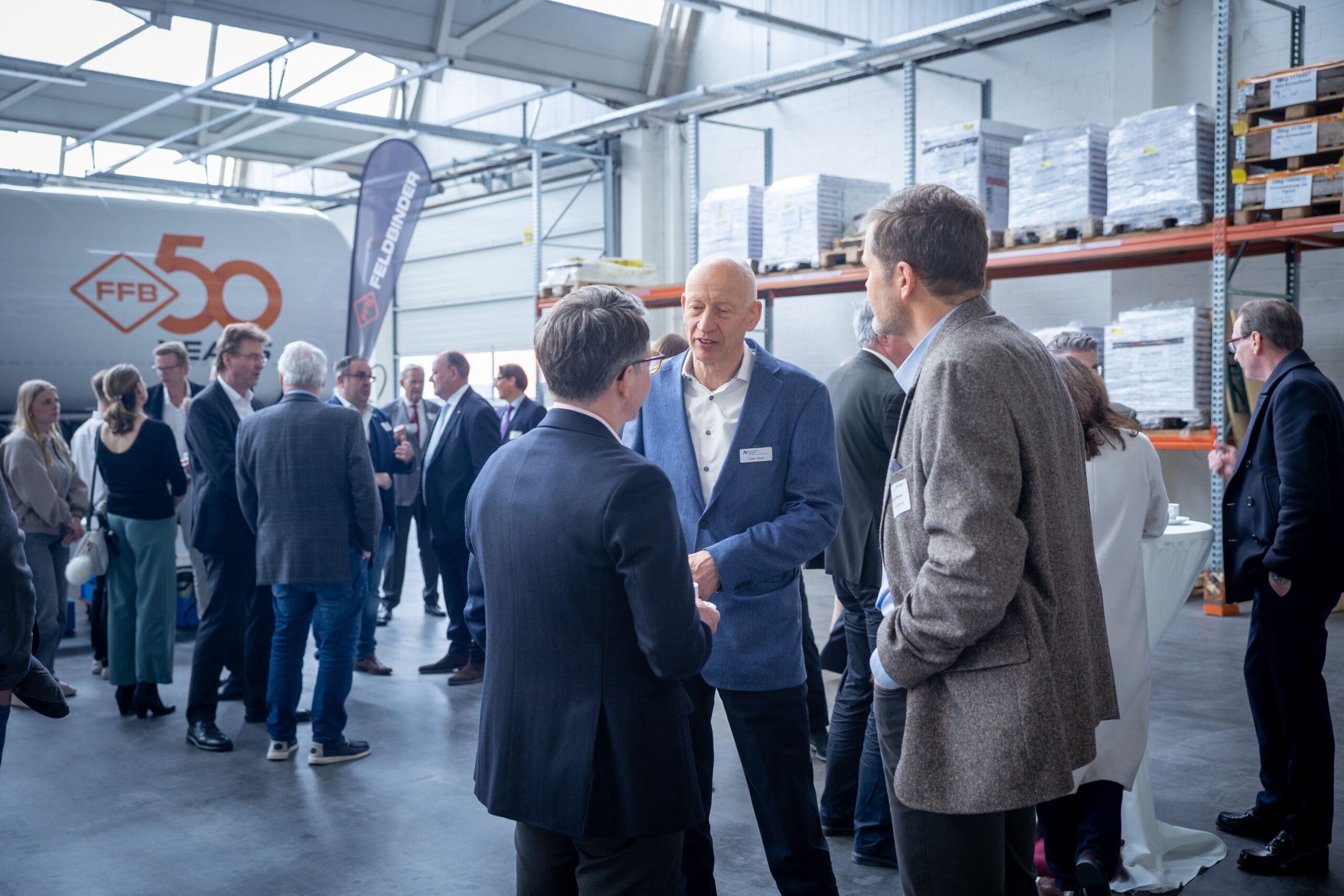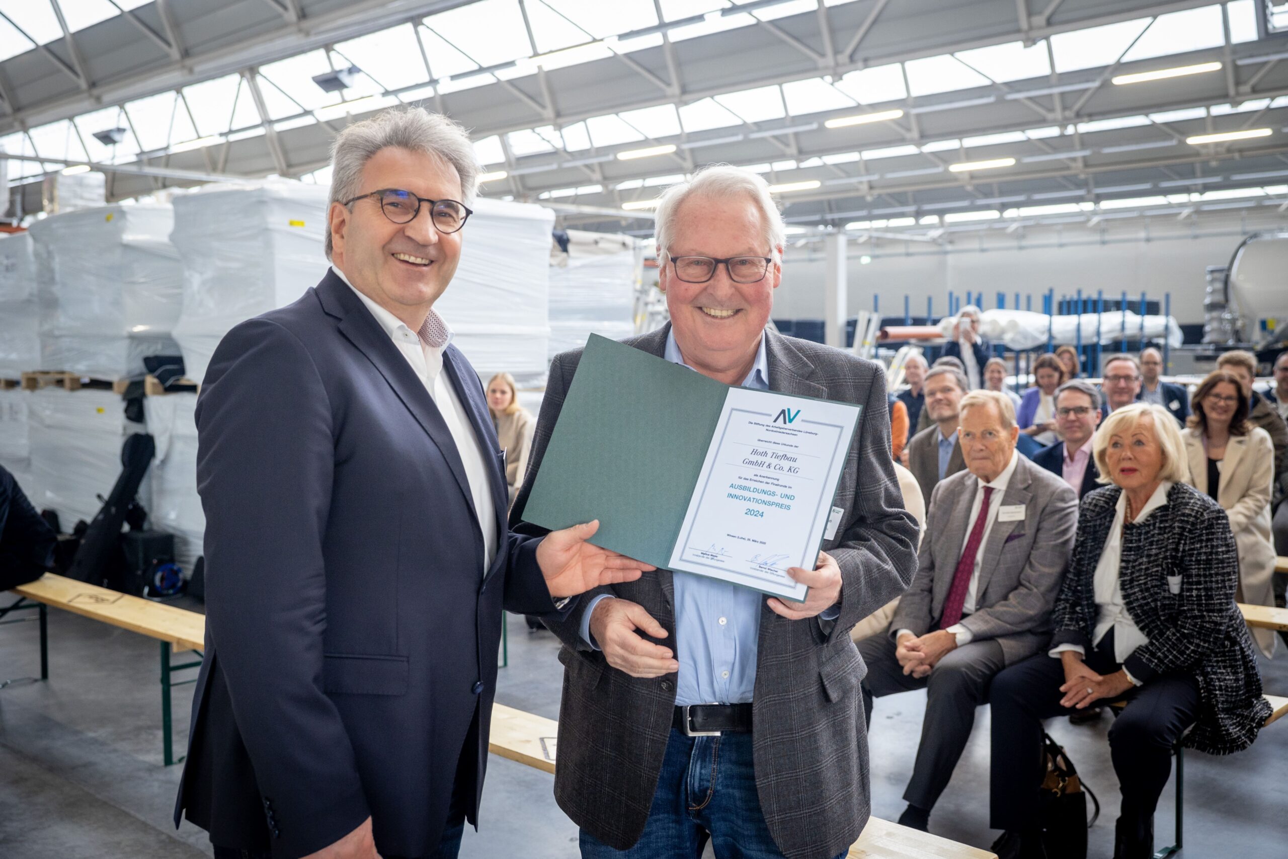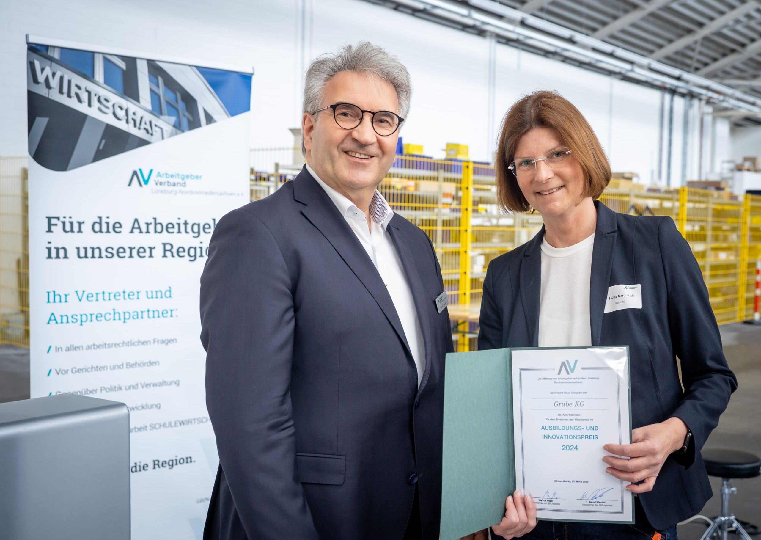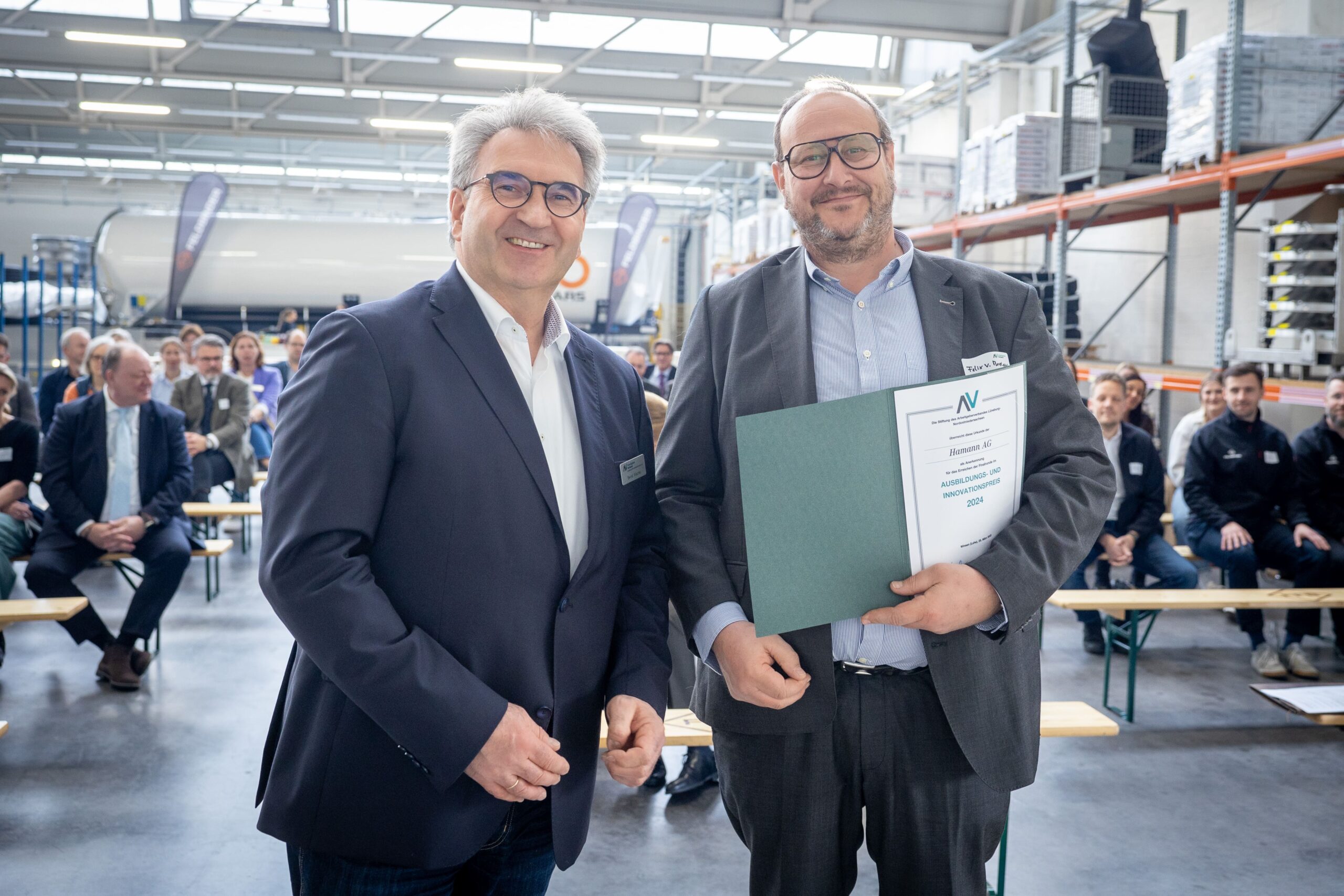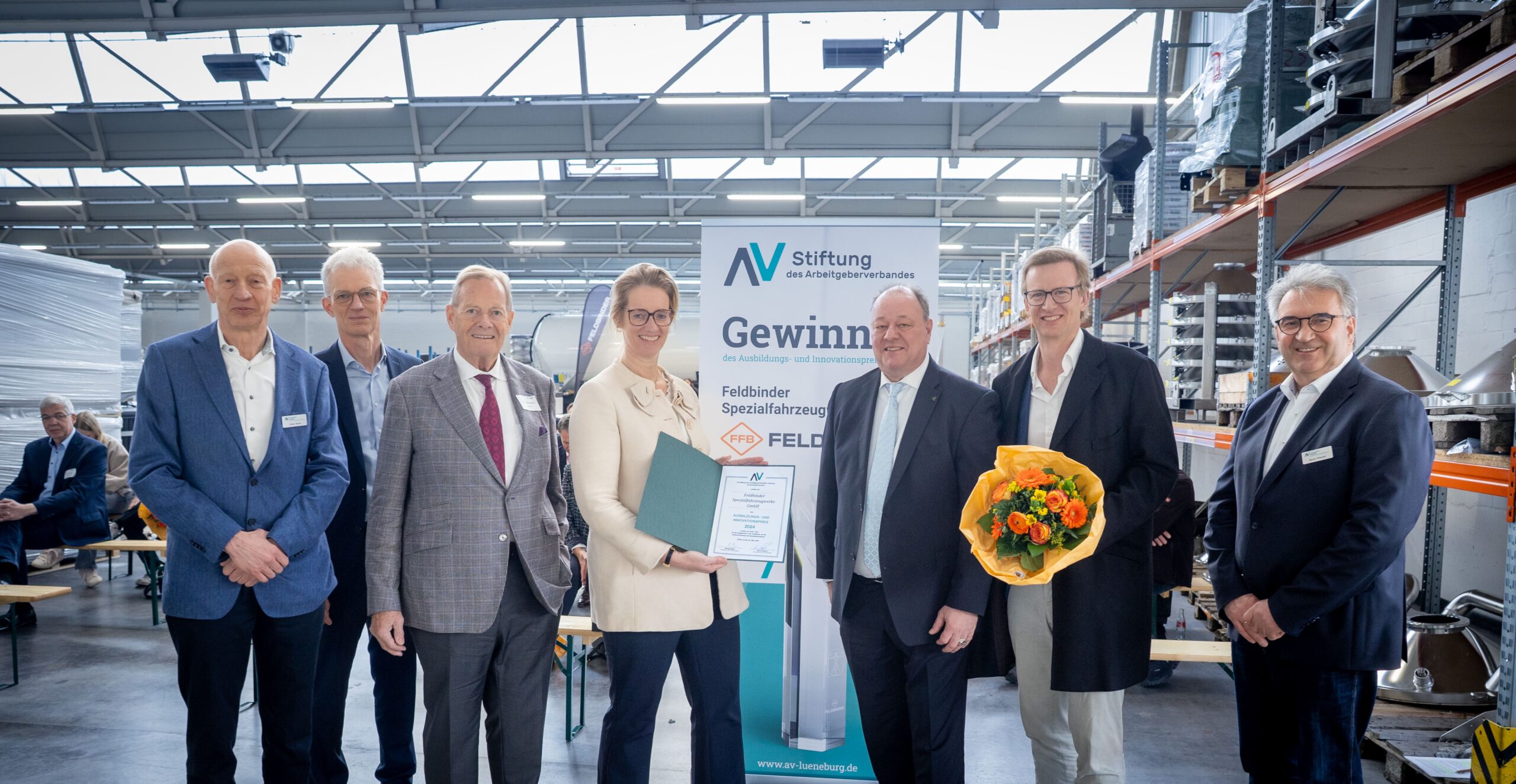 Mehr als 50 Gäste kamen zur feierlichen Verleihung des Preises im Logisitkzentrum des Familienunternehmens in Winsen zusammen. Nach der Begrüßung durch Markus Meyer und der Verleihung des Preises an die Feldbinder Geschäftsführer Dirk Feldbinder sowie Dr. Nina Lorea Kley und Wolf-Dietrich Kley, konnten die Gäste bei einer Betriebsbesichtigung einen Blick hinter die Kulissen des Unternehmens werfen. Außerdem wurden die weiteren Finalisten Hoth Tiefbau GmbH & Co. KG, Saxwerk GmbH, Hamann AG und Grube KG durch Stiftungsvorstand und AV-Hauptgeschäftsführer Bernd Wiechel mit einer Anerkennungsurkunde für das Erreichen der Finalrunde geehrt.